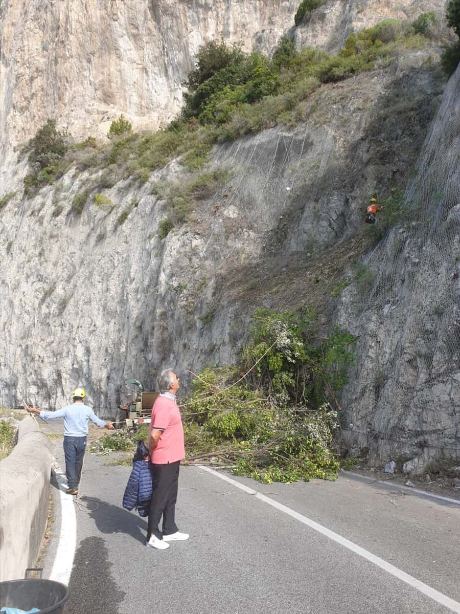 MAIORI – Si lavora anche di domenica alla parete rocciosa del “Cavallo Morto” da cui giovedì scorso, poco prima delle 13 e 30, è venuto già, da altezza considerevole, un grosso masso frantumatosi sulla Statale 163 Amalfitana determinandone la chiusura al transito veicolare. Da ieri rocciatori specializzati della Genea Consorzio Stabile di Salerno, impresa incaricata dal Genio Civile della bonifica e messa in sicurezza dell’area a rischio, hanno cominciato con un’attenta ispezione della superficie di circa 4mila metri quadrati con il taglio della vegetazione spontanea che potrebbe nascondere sorprese e fratture nella roccia. Sul posto, stamani, si sono portati il sindaco di Maiori Antonio Capone, i funzionari del Genio Civile e il titolare della Genea Angelo Grimaldi con i tecnici Giancarlo Giordano e Vincenzo Sada.